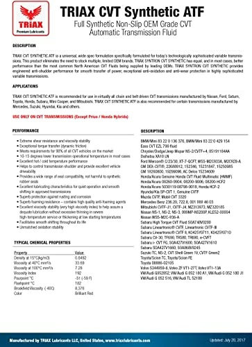 TRIAX SYNTRON CVT SYNTHETIC is a universal, wide spec formulation specifically formulated for todayβs technologically sophisticated variable transmissions. This product eliminates the need to stock multiple limited OEM brands. TRIAX SYNTRON CVT SYNTHETIC has equal (and in most cases better) performance than the most common North American CVT Fluids being supplied by leading OEMs. TRIAX SYNTRON CVT SYNTHETIC provides engineered anti-shudder performance for a smooth transfer of power, exceptional anti-oxidation, and anti-wear protection in highly sophisticated variable transmissions.