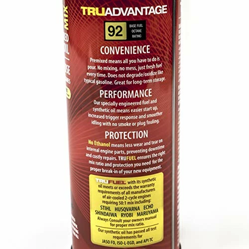 - Pre-blended for outdoor power equipment – TruFuel provides the perfect fuel for all 2-cycle, air-cooled engines requiring a 50:1 mix